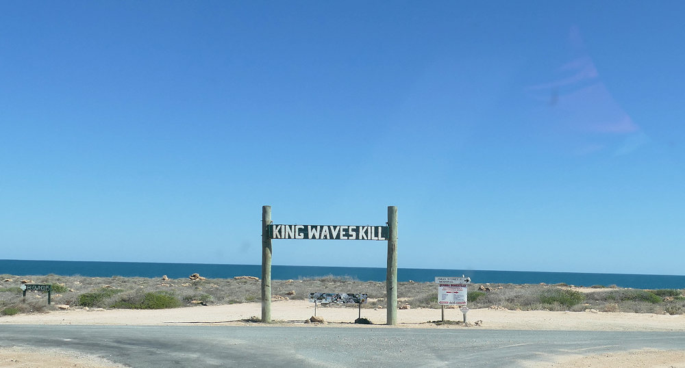 An den Blowholes in Point Quobba. Das Schild warnt vor Monsterwellen, die jederzeit auftreten können.
