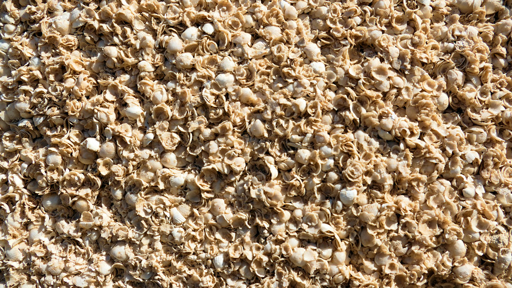 Von der Nähe sieht man die durch natürliche Vorgänge zusammengebackenen Muscheln.