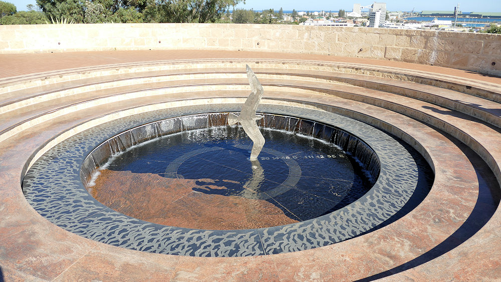 Der Brunnen ist voller Symbolik: Die Möve in der Mitte markiert die Stelle des Wracks, der bräunliche Boden des Beckens stellt die Landmasse dar. Deutlich ist die Shark Bay zu erkennen. Jede Möve am Beckenrand ist symbolisch für einen ertrunkenen Seemann. |