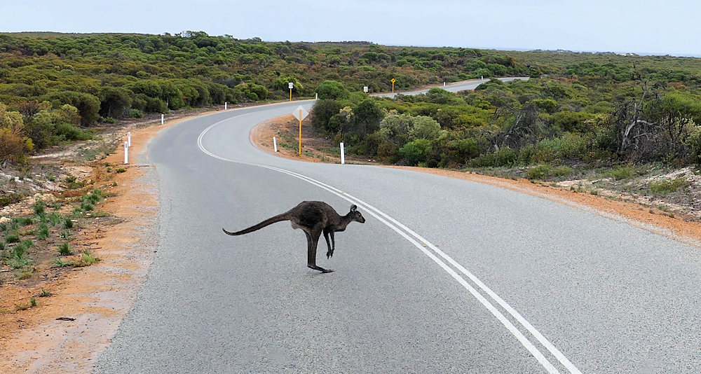 Auch beim Herausfahren aus dem Park huschen die Kängurus über die Straße.